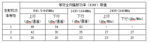 注:標(biāo)準(zhǔn)中把樣機(jī)發(fā)射機(jī)劃分為3個(gè)等級(jí),客戶聲明的發(fā)射機(jī)等級(jí)的功率不得超過相應(yīng)等級(jí)的發(fā)射功率。廠商在設(shè)計(jì)時(shí)應(yīng)注意在滿足使用要求的前提下盡量降低發(fā)射功率,2408-2440MHz頻段只作為備份頻段使用。